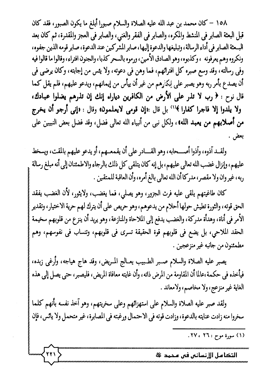 158- كان محمد بن عبد الله عليه الصلاة والسلام صبورا أبلغ ما يكون الصبور، فقد كان قبل البعثة الصابر فى المنشط والمكره، والصابر فى الفقر والغني، والصابر فى العجز والمقدرة، ثم كان بعد البعثة الصابر فى أداء الرسالة، وتبليغها والدعوة إليها، صابر المشركين عند الدعوة، صابر قومه الذين جفوه، ونكروه وهم يعرفونه، وكذبوه، وهو الصادق الأمين، ورموه بالسحر كذبا، والجنون افتراء، وقالوا ما قالوا فيه وفى رسالته، وقد وسع صبره كل افترائهم، فما وهن فى دعوته، ولا يئس من إجابته، وكان يرضى فى أن يصدع بأمر ربه وهو يصبر على إنكارهم من غير أن ييأس من إيمانهم، ويدعو عليهم، فلم يقل كما قال نوح: رَبِّ لا تَذَرْ عَلَى الْأَرْضِ مِنَ الْكافِرِينَ دَيَّاراً. إِنَّكَ إِنْ تَذَرْهُمْ يُضِلُّوا عِبادَكَ، وَلا يَلِدُوا إِلَّا فاجِراً كَفَّاراً «1» بل قال: «إن قومى لا يعلمون» وقال: «إنى أرجو أن يخرج من أصلابهم من يعبد الله» ، ولكل نبى من أنبياء الله تعالى فضل، وقد فضل بعض النبيين على بعض.