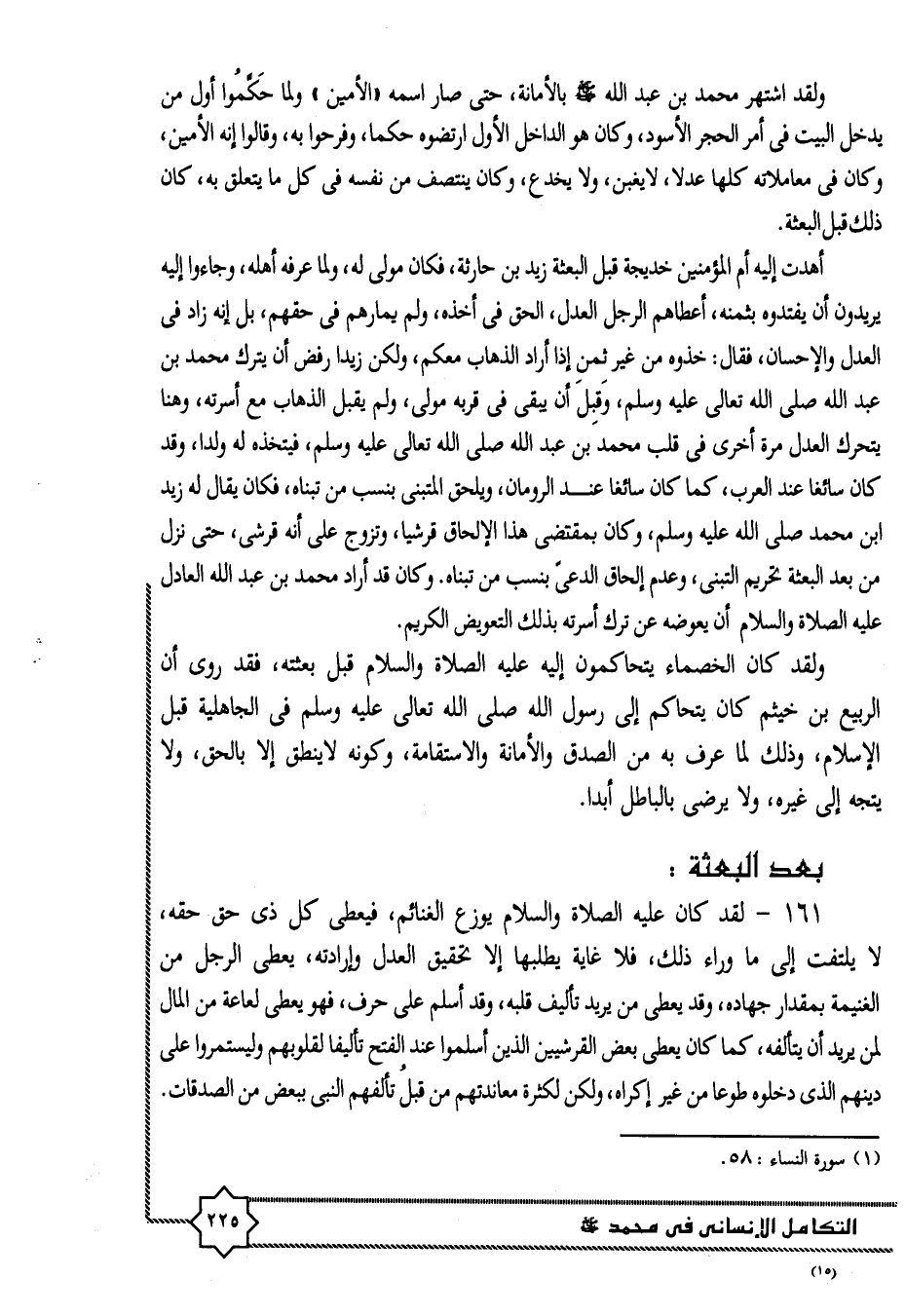 ولقد اشتهر محمد بن عبد الله صلّى الله عليه وسلّم بالأمانة، حتى صار اسمه «الأمين» ولما حكّموا أول من يدخل البيت فى أمر الحجر الأسود، وكان هو الداخل الأول ارتضوه حكما، وفرحوا به، وقالوا إنه الأمين، وكان فى معاملاته كلها عدلا، لا يغبن، ولا يخدع، وكان ينتصف من نفسه فى كل ما يتعلق به، كان ذلك قبل البعثة.