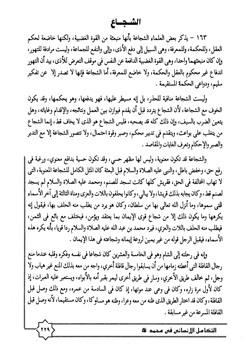 163- يذكر بعض العلماء الشجاعة بأنها منبعثة من القوة الغضبية، ولكنها خاضعة لحكم العقل، وللحكمة، وللمعرفة، وهى السبيل إلى دفع الأذى، وإلى والنفع للجماعة، وليست مرادفة للتهور، وإن كان منبعثهما واحدا، وهى القوة الغضبية الدافعة عن النفس فى موقف التعرض للأذى، بيد أن التهور اندفاع غير محكوم بالعقل والحكمة، ولا خاضع للمعرفة، أما الشجاعة فإنها لا تصدر إلا عن تفكير سليم، ودواعى الحكمة المستقيمة.