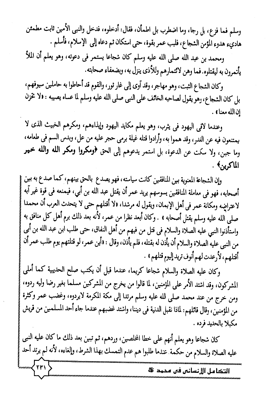 ومحمد بن عبد الله صلى الله عليه وسلم كان شجاعا يستمر فى دعوته، وهو يعلم أن الملأ يأتمرون به ليقتلوه. فما وهن لائتمارهم وللأذى ينزل به، وبضعفاء صحابته.