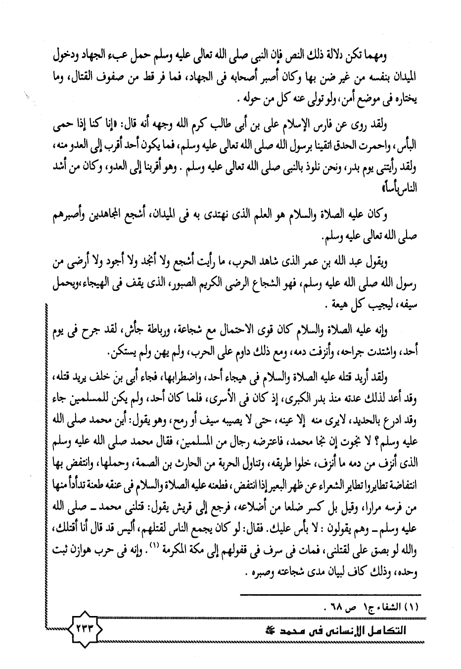 ولقد روى عن فارس الإسلام على بن أبى طالب كرم الله وجهه أنه قال: «إنا كنا إذا حمى البأس، واحمرت الحدق اتقينا برسول الله صلى الله تعالى عليه وسلم، فما يكون أحد أقرب إلى العدو منه، ولقد رأيتنى يوم بدر، ونحن نلوذ بالنبى صلى الله تعالى عليه وسلم. وهو أقربنا إلى العدو، وكان من أشد الناس بأسا»