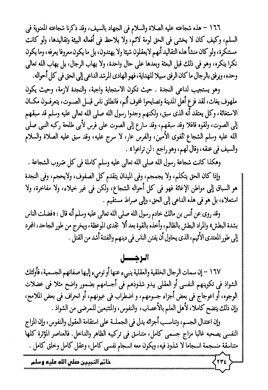 166- هذه شجاعته عليه الصلاة والسلام فى الجهاد بالسيف، وقد ذكرنا شجاعته المعنوية فى السلم، وكيف كان لا يخشى فى الحق لومة لائم، ولا يلاحظ فى أفعاله البيئة وتقاليدها، ولو كانت مستنكرة، ولو كان منشأ هذه التقاليد أنهم لا يعقلون شيئا ولا يهتدون، بل ما يكون معروفا يعرفه، وما يكون نكرا ينكره، وهو فى ذلك قبل البعثة وبعدها على حال واحدة، ولا يهاب الرجال، بل يهاب الله تعالى واحده، ويرفق بالرجال ما كان الرفق سبيلا للهداية، فهو الهادى المرشد الداعى إلى الحق فى كل أحواله.