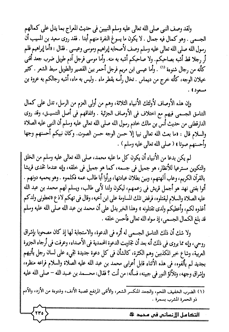 ولقد وصف النبى صلى الله تعالى عليه وسلم النبيين فى حديث المعراج بما يدل على كمالهم الجسمى. وهو كمال فيه جمال. لا يكون ما يسوغ النفرة منهم أبدا. فقد روى سعيد بن المسيب أن رسول الله صلى الله تعالى عليه وسلم وصف لأصحابه إبراهيم وموسى وعيسى. فقال: «أما إبراهيم فلم أر رجلا قط أشبه بصاحبكم. ولا صاحبكم أشبه به منه. وأما موسى فرجل ادم طويل ضرب جعد أقنى كأنه من رجال شنوءة «1» . وأما عيسى ابن مريم فرجل أحمر بين القصير والطويل سبط الشعر. كثير خيلان الوجه، كأنه خرج من ديماس. تخال رأسه يقطر ماء. وليس به ماء، أشبه رجالكم به عروة بن مسعود» .