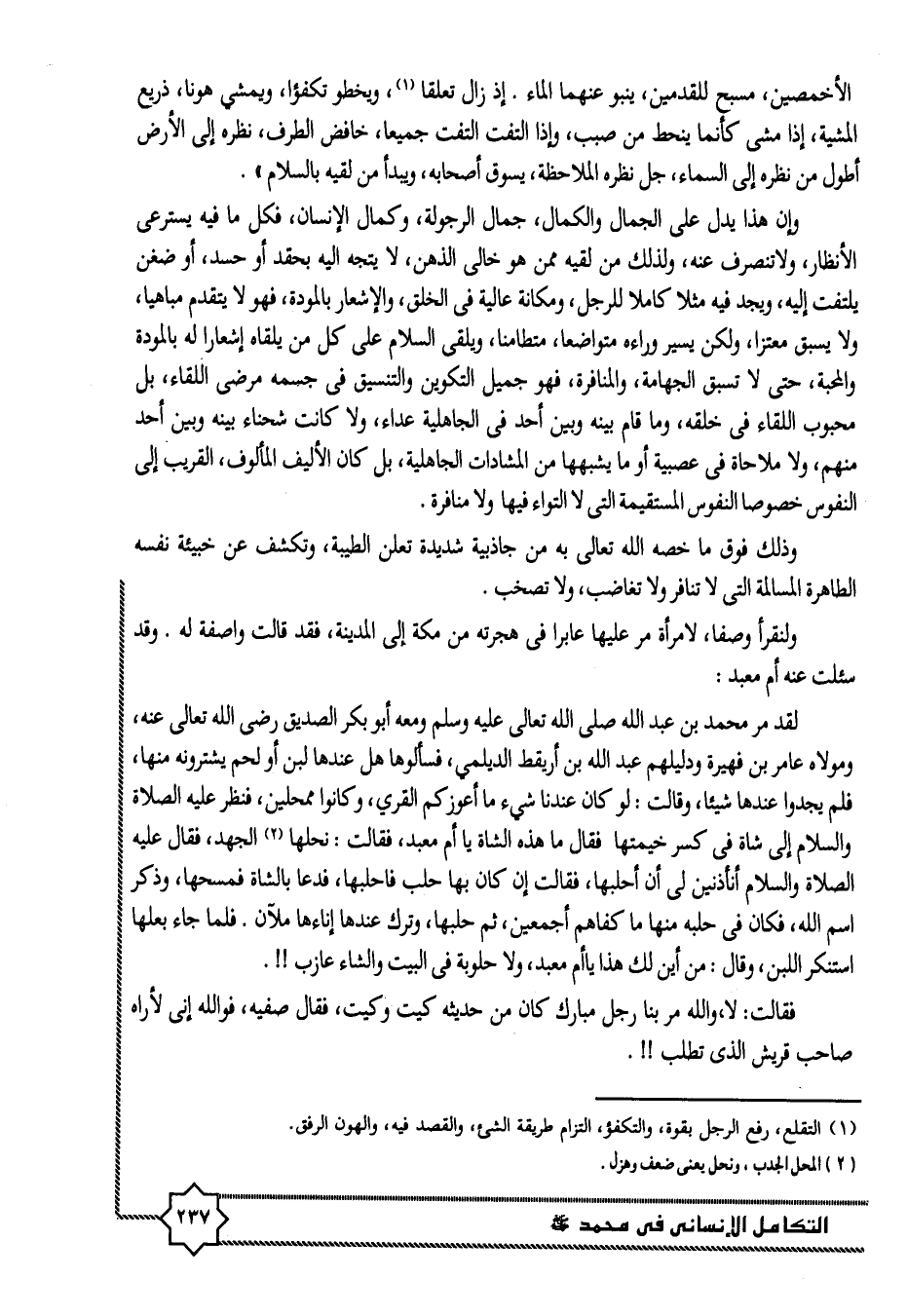 وإن هذا يدل على الجمال والكمال، جمال الرجولة، وكمال الإنسان، فكل ما فيه يسترعى الأنظار، ولا تنصرف عنه، ولذلك من لقيه ممن هو خالى الذهن، لا يتجه اليه بحقد أو حسد، أو ضغن يلتفت إليه، ويجد فيه مثلا كاملا للرجل، ومكانة عالية فى الخلق، والإشعار بالمودة، فهو لا يتقدم مباهيا، ولا يسبق معتزا، ولكن يسير وراءه متواضعا، متطامنا، ويلقى السلام على كل من يلقاه إشعارا له بالمودة والمحبة، حتى لا تسبق الجهامة، والمنافرة، فهو جميل التكوين والتنسيق فى جسمه مرضى اللقاء، بل محبوب اللقاء فى خلقه، وما قام بينه وبين أحد فى الجاهلية عداء، ولا كانت شحناء بينه وبين أحد منهم، ولا ملاحاة فى عصبية أو ما يشبهها من المشادات الجاهلية، بل كان الأليف المألوف، القريب إلى النفوس خصوصا النفوس المستقيمة التى لا التواء فيها ولا منافرة.