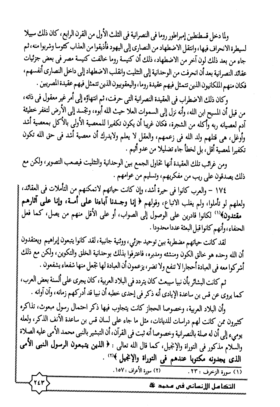 174- والعرب كانوا فى حيرة أشد، وإن كانت حياتهم لا تمكنهم من التأملات فى العقائد، ولعلهم لو تأملوا، ولم يغلب الاتباع، وقولهم إِنَّا وَجَدْنا آباءَنا عَلى أُمَّةٍ، وَإِنَّا عَلى آثارِهِمْ مُقْتَدُونَ «1» لكانوا قادرين على الوصول إلى الصواب، أو على الأقل منهم من يصل، كما فعل الحنفاء، وأنهم كانوا قبل البعثة عددا محدودا.
