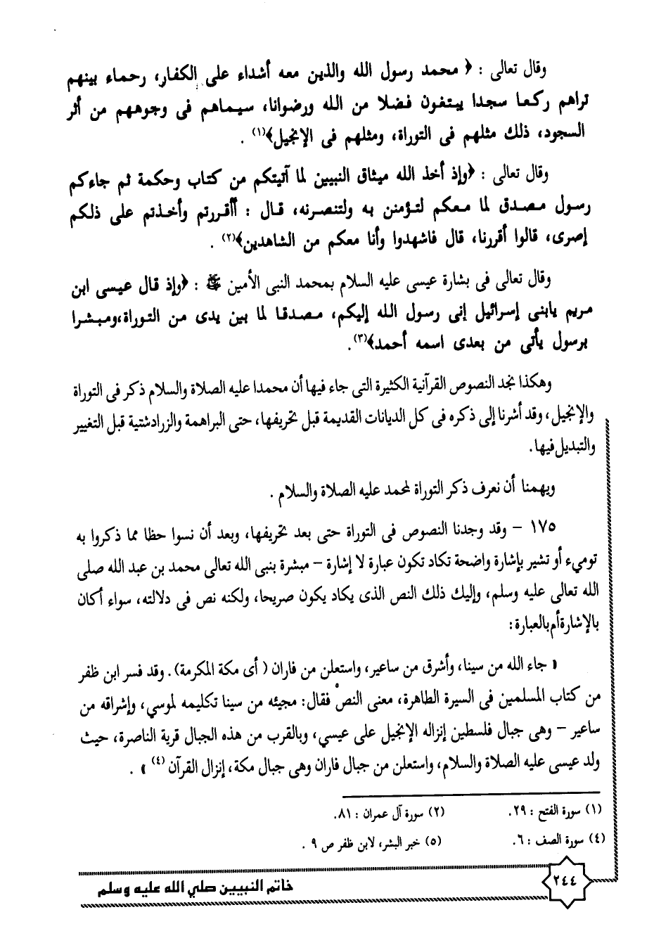 «جاء الله من سينا، وأشرق من ساعير، واستعلن من فاران (أى مكة المكرمة) . وقد فسر ابن ظفر من كتاب المسلمين فى السيرة الطاهرة، معنى النص فقال: مجيئه من سينا تكليمه لموسي، وإشراقه من ساعير- وهى جبال فلسطين إنزاله الإنجيل على عيسي، وبالقرب من هذه الجبال قرية الناصرة، حيث ولد عيسى عليه الصلاة والسلام، واستعلن من جبال فاران وهى جبال مكة، إنزال القران «4» » .