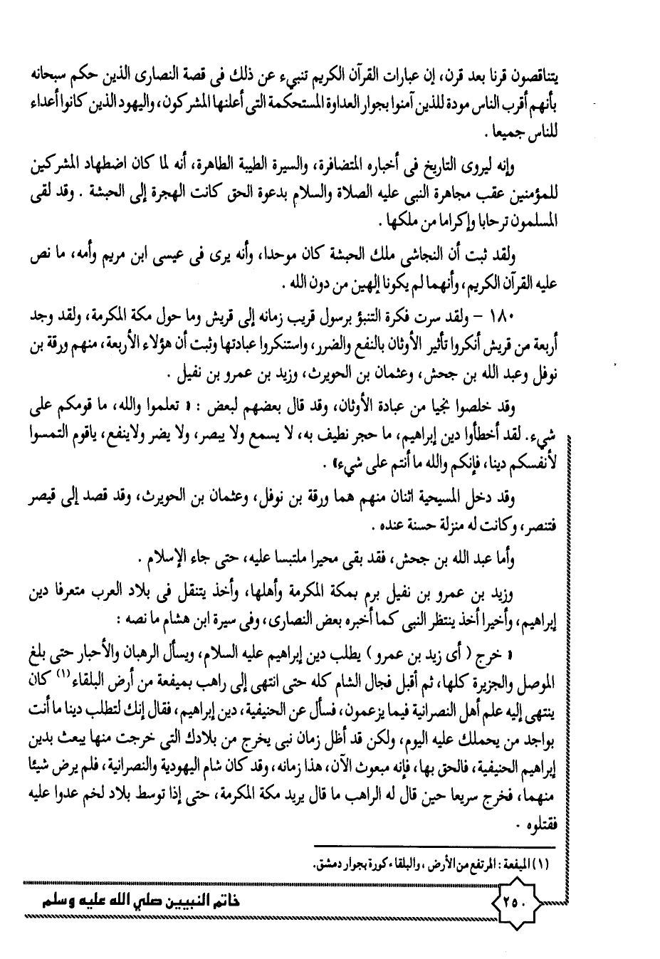 «خرج (أى زيد بن عمرو) يطلب دين إبراهيم عليه السلام، ويسأل الرهبان والأحبار حتى بلغ الموصل والجزيرة كلها، ثم أقبل فجال الشام كله حتى انتهى إلى راهب بميفعة من أرض البلقاء «1» كان ينتهى إليه علم أهل النصرانية فيما يزعمون، فسأل عن الحنيفية، دين إبراهيم، فقال إنك لتطلب دينا ما أنت بواجد من يحملك عليه اليوم، ولكن قد أظل زمان نبى يخرج من بلادك التى خرجت منها يبعث بدين إبراهيم الحنيفية، فالحق بها، فإنه مبعوث الان، هذا زمانه، وقد كان شام اليهودية والنصرانية، فلم يرض شيئا منهما، فخرج سريعا حين قال له الراهب ما قال يريد مكة المكرمة، حتى إذا توسط بلاد لخم عدوا عليه فقتلوه.