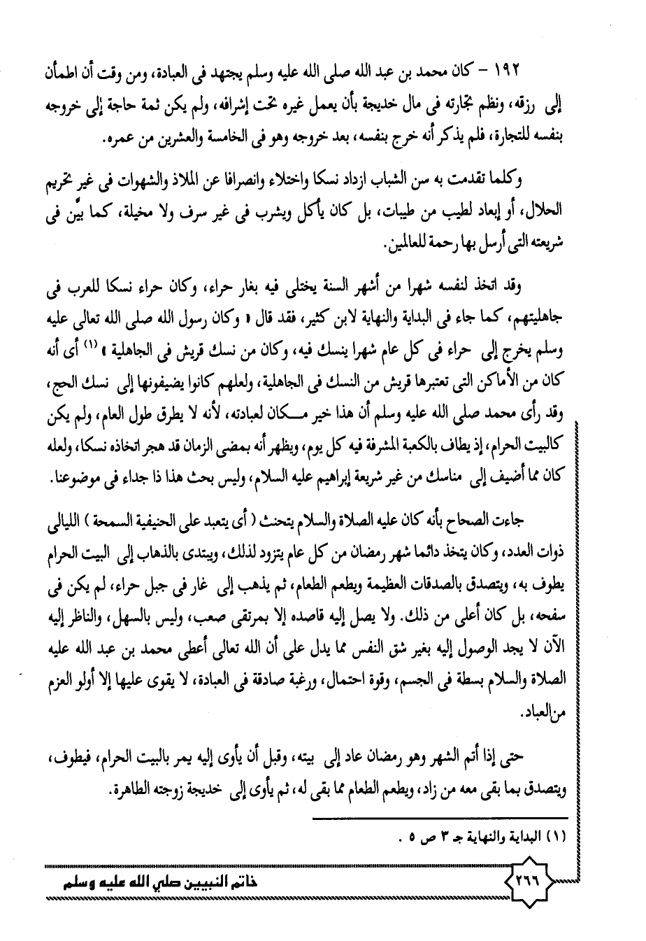 192- كان محمد بن عبد الله صلى الله عليه وسلم يجتهد فى العبادة، ومن وقت أن اطمأن إلى رزقه، ونظم تجارته فى مال خديجة بأن يعمل غيره تحت إشرافه، ولم يكن ثمة حاجة إلى خروجه بنفسه للتجارة، فلم يذكر أنه خرج بنفسه، بعد خروجه وهو فى الخامسة والعشرين من عمره.