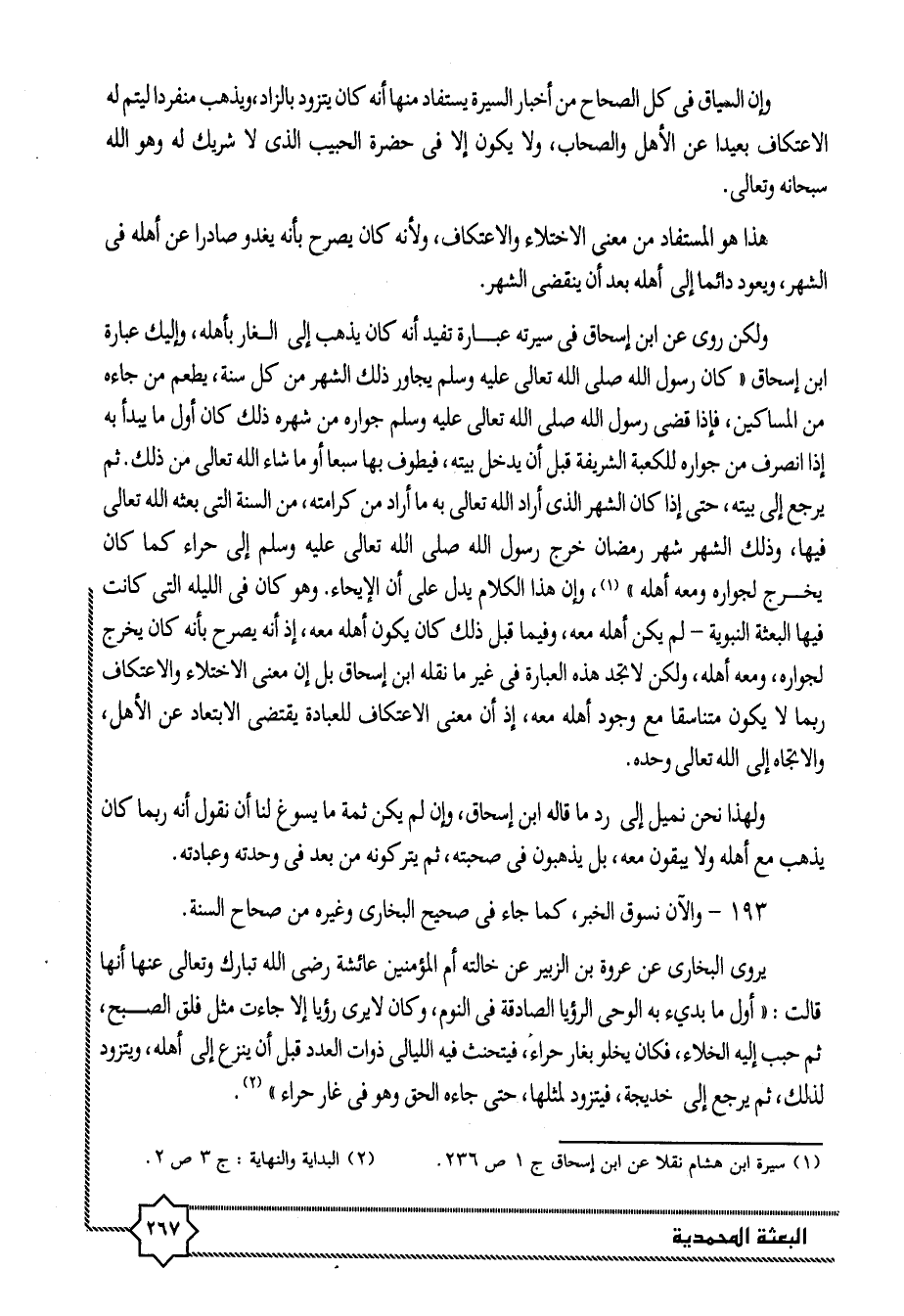 ولهذا نحن نميل إلى رد ما قاله ابن إسحاق، وإن لم يكن ثمة ما يسوغ لنا أن نقول أنه ربما كان يذهب مع أهله ولا يبقون معه، بل يذهبون فى صحبته، ثم يتركونه من بعد فى واحدته وعبادته.