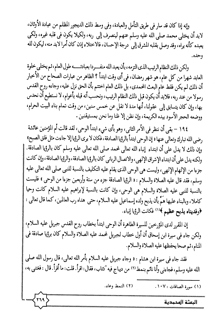 194- بقى أن ننظر فى الأمر الثانى، وهو بأى شيء ابتدأ الوحى، لقد قالت أم المؤمنين عائشة رضى الله تبارك وتعالى عنها «إن الوحى ابتدأ بالرؤيا الصادقة، فكان لا يرى الرؤيا إلا جاءت مثل فلق الصبح» وإن ذلك لا يدل على أن ابتداء إنباء الله تعالى لمحمد صلى الله تعالى عليه وسلم كان بالرؤيا الصادقة.