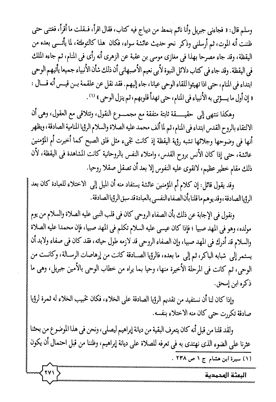 ونقول فى الإجابة عن ذلك بأن الصفاء الروحى كان فى قلب النبى عليه الصلاة والسلام من يوم مولده، وهو فى المهد صبيا؛ فإذا كان عيسى عليه السلام تكلم فى المهد صبيا، فإن محمدا عليه الصلاة والسلام قد أدرك فى المهد صبيا، وإن الصفاء الروحى قد لازمه طول حياته، فقد كان فى صفاء ولابد أن يستمر إلى شبابه الباكر، ثم إلى ما بعده، فالرؤيا الصادقة كانت من إرهاصات الرسالة، وكانت من الوحى، ثم كانت فى المرحلة الأخيرة منها، وحيا بما يراه من خطاب الوحى بالأمين جبريل، وهى ما ذكره ابن إسحاق.
