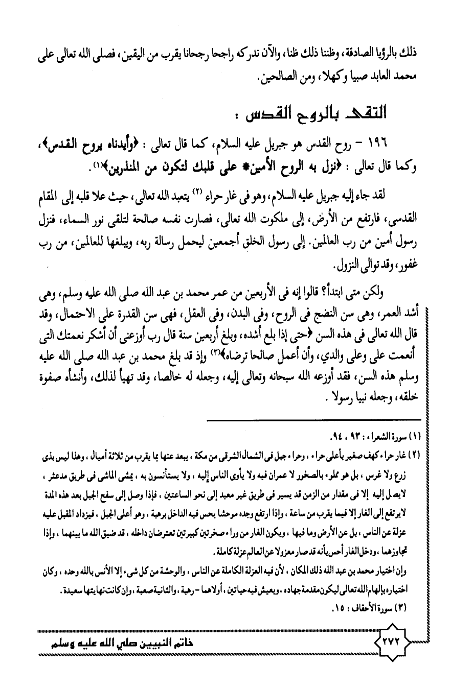 ولكن متى ابتدأ؟ قالوا إنه فى الأربعين من عمر محمد بن عبد الله صلى الله عليه وسلم، وهى أشد العمر، وهى سن النضج فى الروح، وفى البدن، وفى العقل، فهى سن القدرة على الاحتمال، وقد قال الله تعالى فى هذه السن حَتَّى إِذا بَلَغَ أَشُدَّهُ، وَبَلَغَ أَرْبَعِينَ سَنَةً قالَ رَبِّ أَوْزِعْنِي أَنْ أَشْكُرَ نِعْمَتَكَ الَّتِي أَنْعَمْتَ عَلَيَّ وَعَلى والِدَيَّ، وَأَنْ أَعْمَلَ صالِحاً تَرْضاهُ «3» وإذ قد بلغ محمد بن عبد الله صلى الله عليه وسلم هذه السن، فقد أوزعه الله سبحانه وتعالى إليه، وجعله له خالصا، وقد تهيأ لذلك، وأنشأه صفوة خلقه، وجعله نبيا رسولا.
