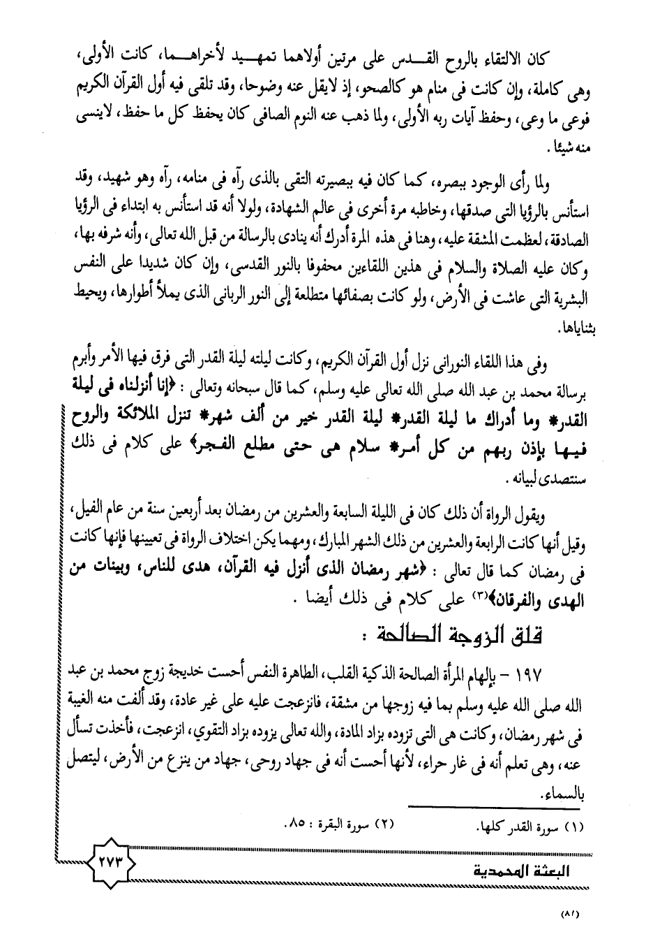 ويقول الرواة أن ذلك كان فى الليلة السابعة والعشرين من رمضان بعد أربعين سنة من عام الفيل، وقيل أنها كانت الرابعة والعشرين من ذلك الشهر المبارك، ومهما يكن اختلاف الرواة فى تعيينها فإنها كانت فى رمضان كما قال تعالى: شَهْرُ رَمَضانَ الَّذِي أُنْزِلَ فِيهِ الْقُرْآنُ، هُدىً لِلنَّاسِ، وَبَيِّناتٍ مِنَ الْهُدى وَالْفُرْقانِ «2» على كلام فى ذلك أيضا.
