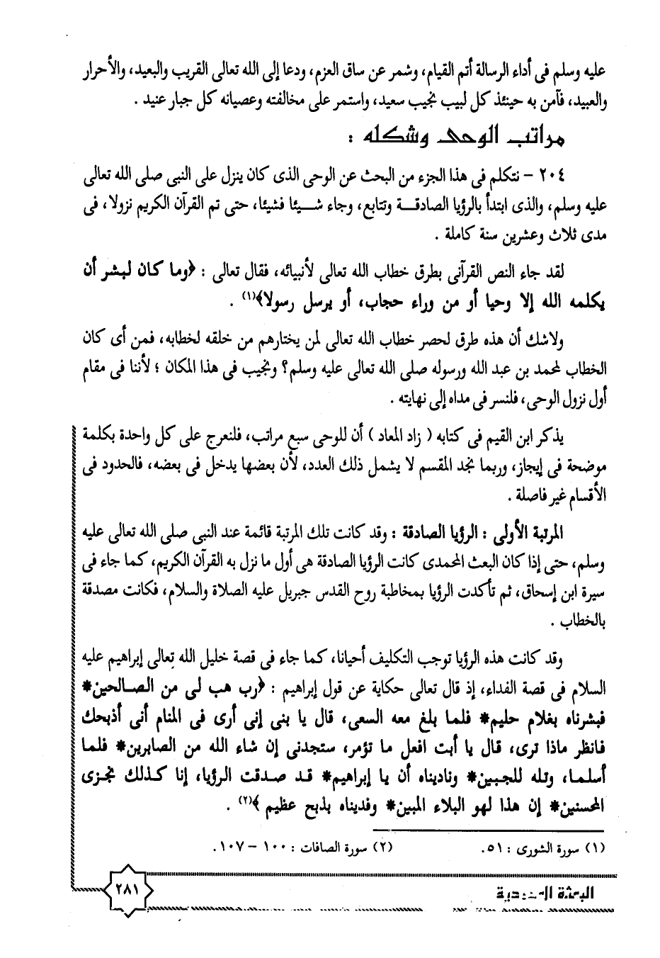 204- نتكلم فى هذا الجزء من البحث عن الوحى الذى كان ينزل على النبى صلى الله تعالى عليه وسلم، والذى ابتدأ بالرؤيا الصادقة وتتابع، وجاء شيئا فشيئا، حتى تم القران الكريم نزولا، فى مدى ثلاث وعشرين سنة كاملة.