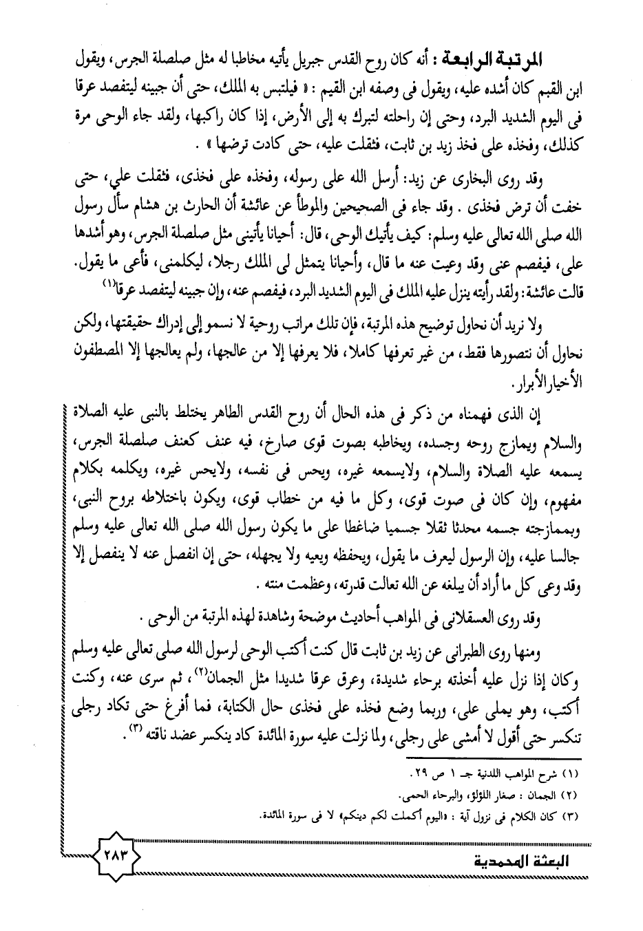 وقد روى البخارى عن زيد: أرسل الله على رسوله، وفخذه على فخذى، فثقلت علي، حتى خفت أن ترض فخذى. وقد جاء فى الصحيحين والموطأ عن عائشة أن الحارث بن هشام سأل رسول الله صلى الله تعالى عليه وسلم: كيف يأتيك الوحى، قال: أحيانا يأتينى مثل صلصلة الجرس، وهو أشدها على، فيفصم عنى وقد وعيت عنه ما قال، وأحيانا يتمثل لى الملك رجلا، ليكلمنى، فأعى ما يقول.