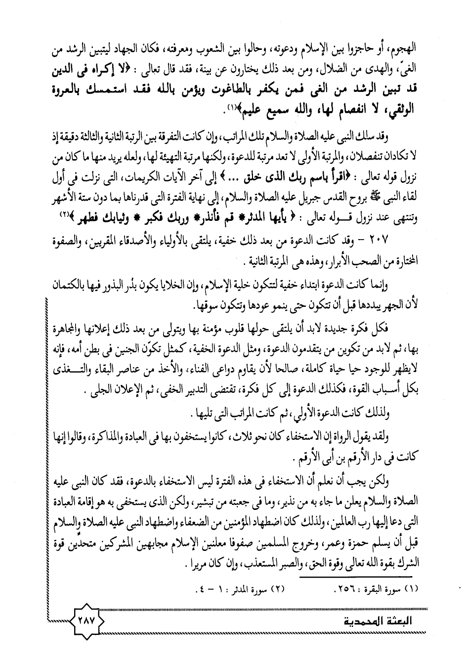 207- وقد كانت الدعوة من بعد ذلك خفية، يلتقى بالأولياء والأصدقاء المقربين، والصفوة المختارة من الصحب الأبرار، وهذه هى المرتبة الثانية.