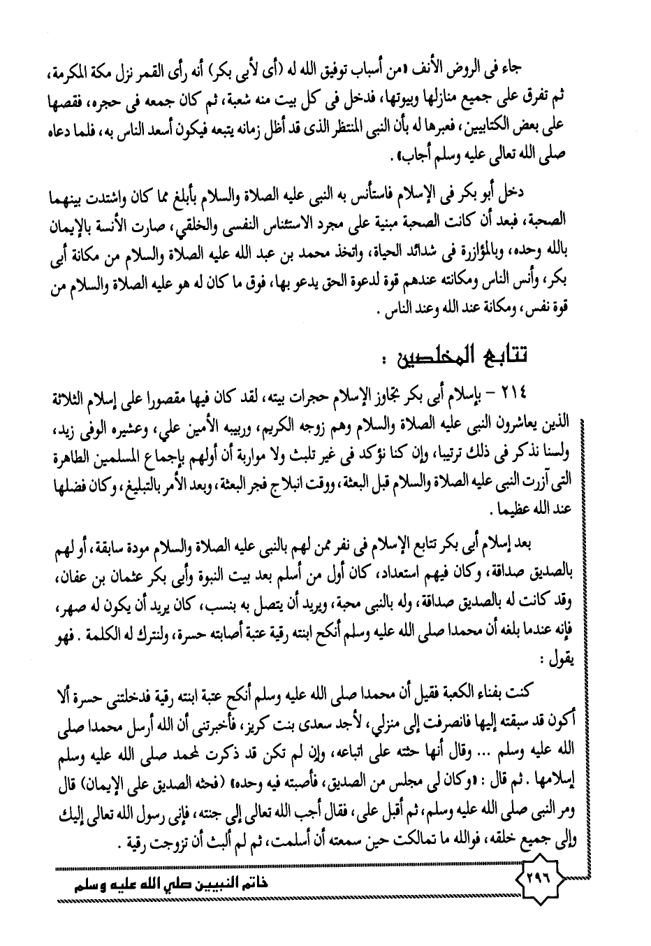214- بإسلام أبى بكر تجاوز الإسلام حجرات بيته، لقد كان فيها مقصورا على إسلام الثلاثة الذين يعاشرون النبى عليه الصلاة والسلام وهم زوجه الكريم، وربيبه الأمين علي، وعشيرة الوفى زيد، ولسنا نذكر فى ذلك ترتيبا، وإن كنا نؤكد فى غير تلبث ولا مواربة أن أولهم بإجماع المسلمين الطاهرة التى ازرت النبى عليه الصلاة والسلام قبل البعثة، ووقت انبلاج فجر البعثة، وبعد الأمر بالتبليغ، وكان فضلها عند الله عظيما.