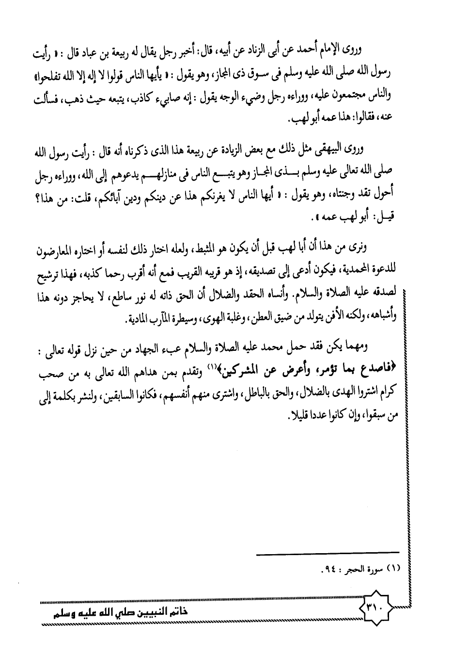 وروى الإمام أحمد عن أبى الزناد عن أبيه، قال: أخبر رجل يقال له ربيعة بن عباد قال: «رأيت رسول الله صلى الله عليه وسلم فى سوق ذى المجاز، وهو يقول: «يا أيها الناس قولوا لا إله إلا الله تفلحوا» والناس مجتمعون عليه، ووراءه رجل وضيء الوجه يقول: إنه صابيء كاذب، يتبعه حيث ذهب، فسألت عنه، فقالوا: هذا عمه أبو لهب.