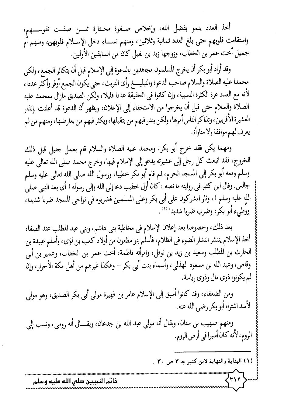 بعد ذلك، وخصوصا بعد إعلان الإسلام فى مخاطبة بنى هاشم، وبنى عبد المطلب عند الصفا، أخذ الإسلام ينتشر انتشار الضوء فى الظلام، فأسلم بنو مظعون من أولاد كعب بن لؤى، وأسلم عبيدة بن الحارث بن المطلب وسعيد بن زيد بن نوفل، وامرأته فاطمة، أخت عمر بن الخطاب، وعمير بن أبى وقاص، وعبد الله بن مسعود الهذلى، وأسماء بنت أبى بكر- وهكذا غيرهم من أهل مكة الأحرار، وإن لم يكونوا ذوى مال وذوى رياسة.