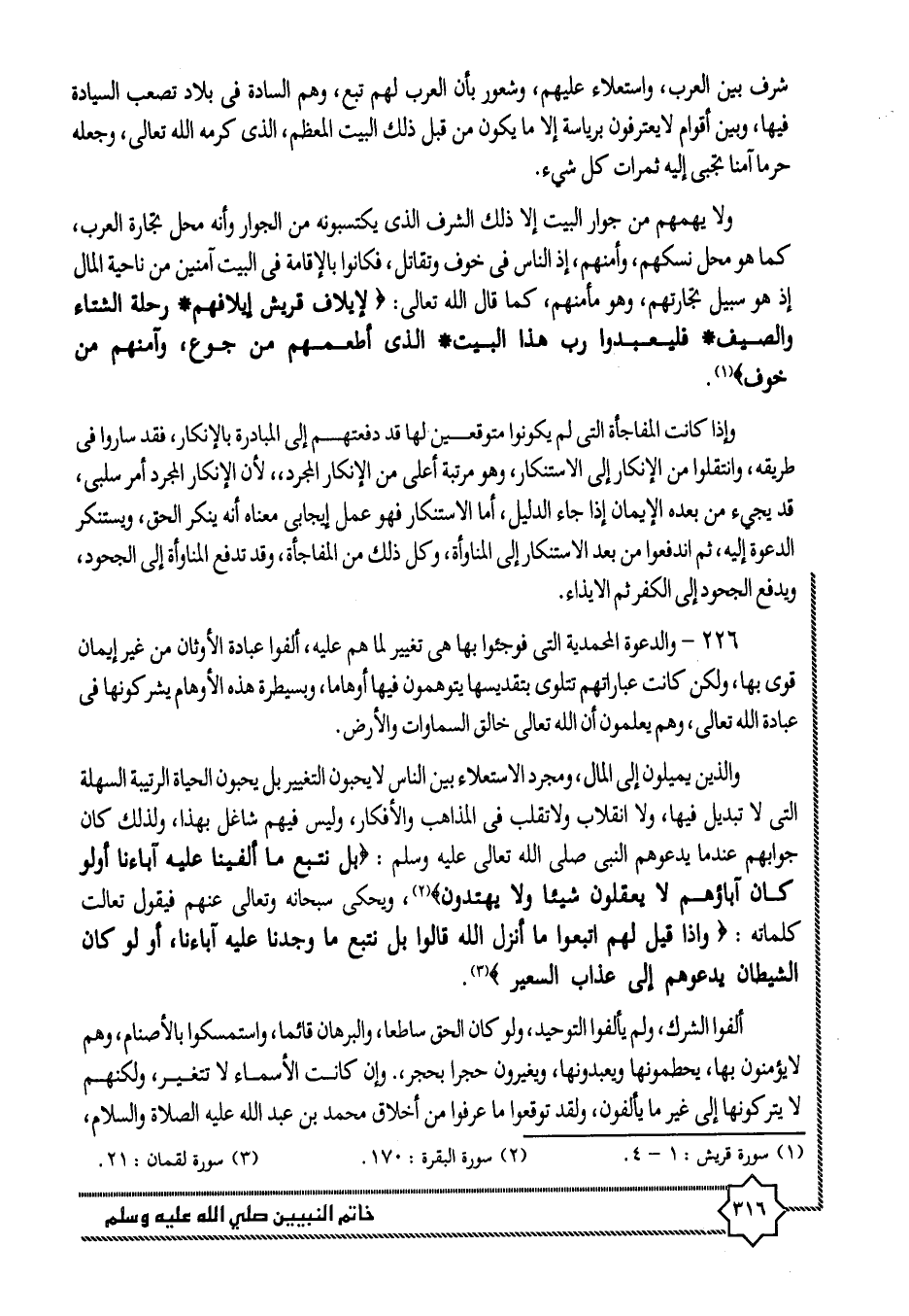226- والدعوة المحمدية التى فوجئوا بها هى تغيير لما هم عليه، ألفوا عبادة الأوثان من غير إيمان قوى بها، ولكن كانت عباراتهم تتلوى بتقديسها يتوهمون فيها أوهاما، وبسيطرة هذه الأوهام يشركونها فى عبادة الله تعالى، وهم يعلمون أن الله تعالى خالق السماوات والأرض.