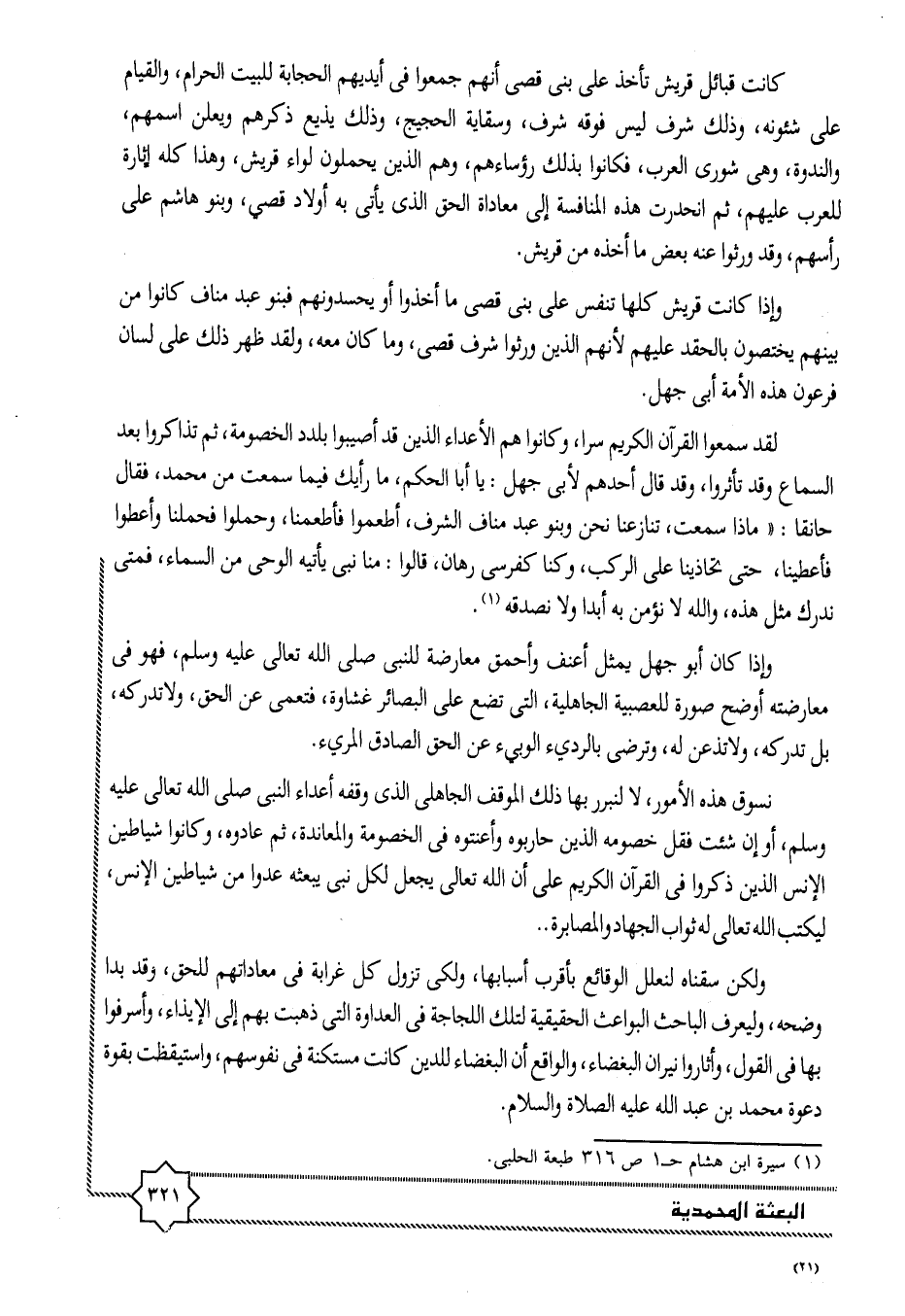 ولكن سقناه لنعلل الوقائع بأقرب أسبابها، ولكى تزول كل غرابة فى معاداتهم للحق، وقد بدا وضحه، وليعرف الباحث البواعث الحقيقية لتلك اللجاجة فى العداوة التى ذهبت بهم إلى الإيذاء، وأسرفوا بها فى القول، وأثاروا نيران البغضاء، والواقع أن البغضاء للدين كانت مستكنة فى نفوسهم، واستيقظت بقوة دعوة محمد بن عبد الله عليه الصلاة والسلام.