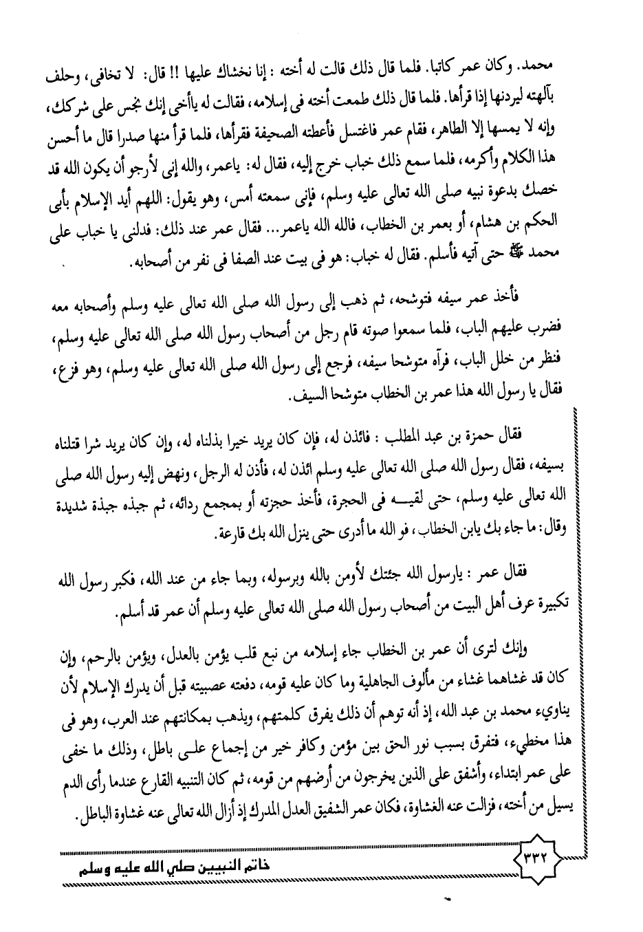 محمد. وكان عمر كاتبا. فلما قال ذلك قالت له أخته: إنا نخشاك عليها!! قال: لا تخافى، وحلف بالهته ليردنها إذا قرأها. فلما قال ذلك طمعت أخته فى إسلامه، فقالت له يا أخى إنك نجس على شركك، وإنه لا يمسها إلا الطاهر، فقام عمر فاغتسل فأعطته الصحيفة فقرأها، فلما قرأ منها صدرا قال ما أحسن هذا الكلام وأكرمه، فلما سمع ذلك خباب خرج إليه، فقال له: يا عمر، والله إنى لأرجو أن يكون الله قد خصك بدعوة نبيه صلى الله تعالى عليه وسلم، فإنى سمعته أمس، وهو يقول: اللهم أيد الإسلام بأبى الحكم بن هشام، أو بعمر بن الخطاب، فالله الله يا عمر ... فقال عمر عند ذلك: فدلنى يا خباب على محمد صلّى الله عليه وسلّم حتى اتيه فأسلم. فقال له خباب: هو فى بيت عند الصفا فى نفر من أصحابه.