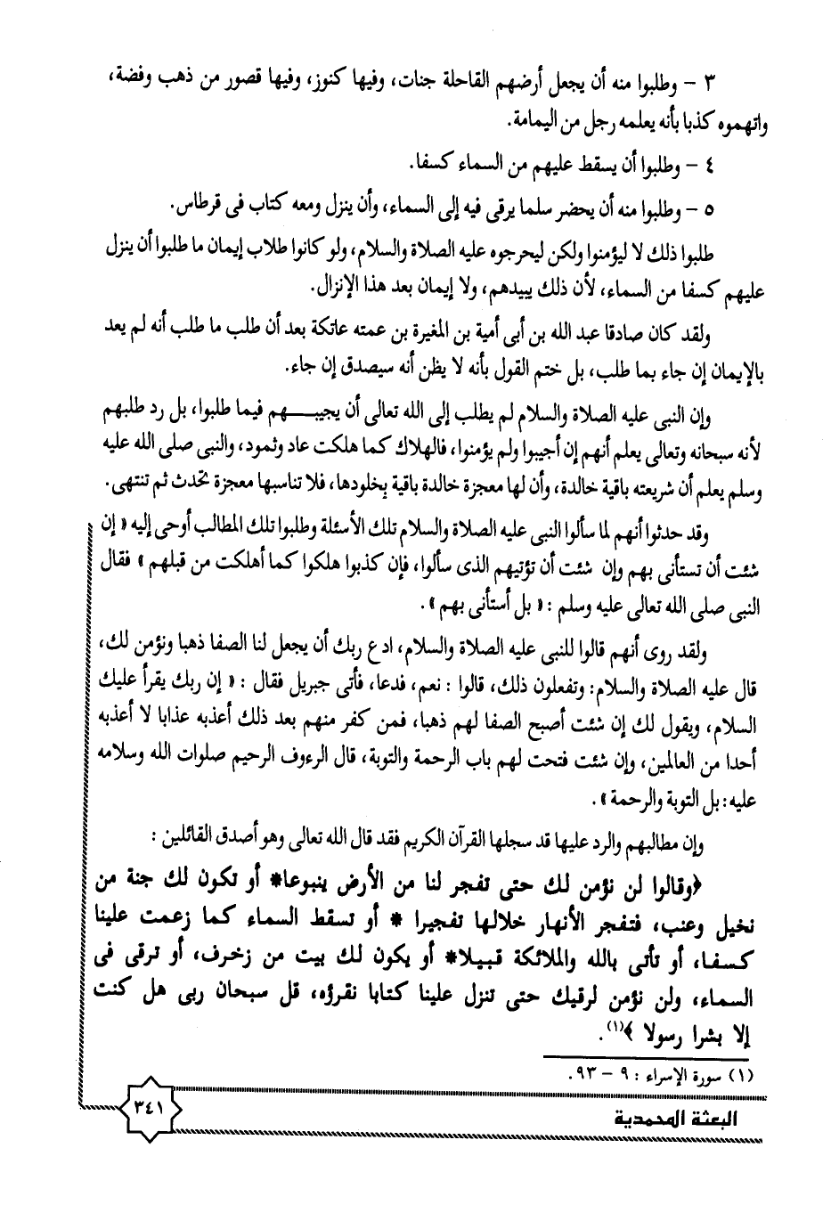 وَقالُوا لَنْ نُؤْمِنَ لَكَ حَتَّى تَفْجُرَ لَنا مِنَ الْأَرْضِ يَنْبُوعاً. أَوْ تَكُونَ لَكَ جَنَّةٌ مِنْ نَخِيلٍ وَعِنَبٍ، فَتُفَجِّرَ الْأَنْهارَ خِلالَها تَفْجِيراً. أَوْ تُسْقِطَ السَّماءَ كَما زَعَمْتَ عَلَيْنا كِسَفاً، أَوْ تَأْتِيَ بِاللَّهِ وَالْمَلائِكَةِ قَبِيلًا. أَوْ يَكُونَ لَكَ بَيْتٌ مِنْ زُخْرُفٍ، أَوْ تَرْقى فِي السَّماءِ، وَلَنْ نُؤْمِنَ لِرُقِيِّكَ حَتَّى تُنَزِّلَ عَلَيْنا كِتاباً نَقْرَؤُهُ، قُلْ سُبْحانَ رَبِّي هَلْ كُنْتُ إِلَّا بَشَراً رَسُولًا «1» .