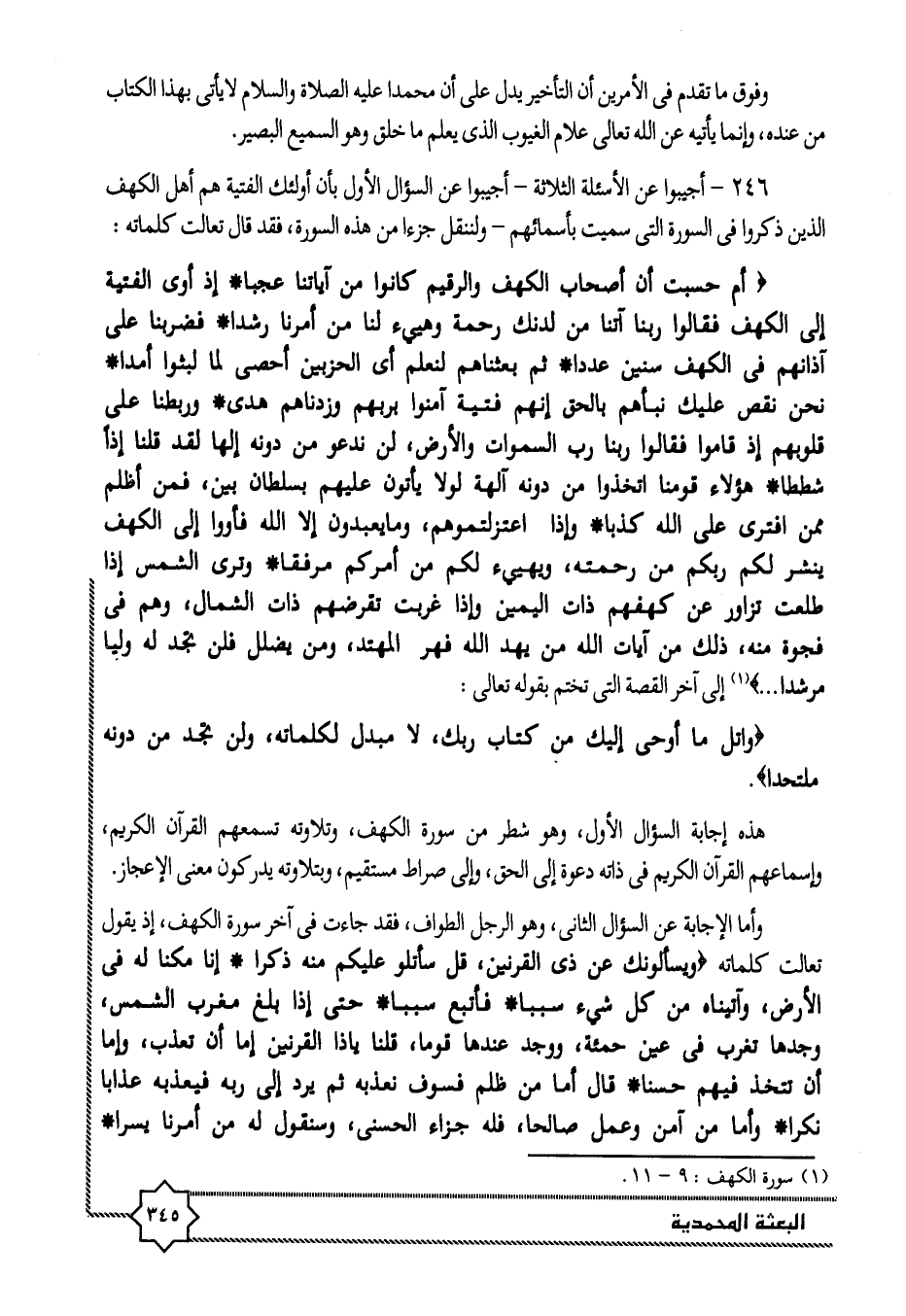 246- أجيبوا عن الأسئلة الثلاثة- أجيبوا عن السؤال الأول بأن أولئك الفتية هم أهل الكهف الذين ذكروا فى السورة التى سميت بأسمائهم- ولننقل جزا من هذه السورة، فقد قال تعالت كلماته: