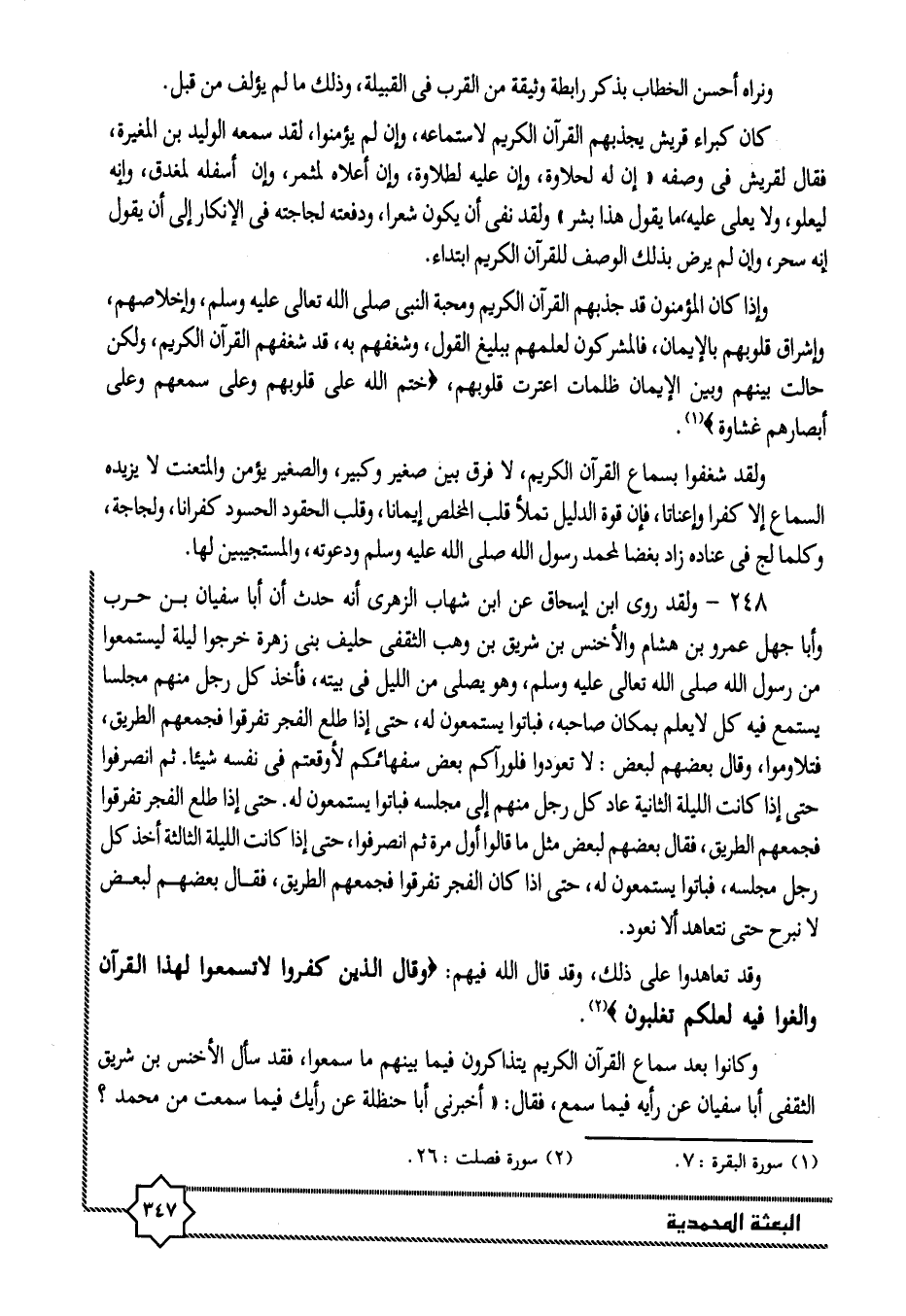 وإذا كان المؤمنون قد جذبهم القران الكريم ومحبة النبى صلى الله تعالى عليه وسلم، وإخلاصهم، وإشراق قلوبهم بالإيمان، فالمشركون لعلمهم ببليغ القول، وشغفهم به، قد شغفهم القران الكريم، ولكن حالت بينهم وبين الإيمان ظلمات اعترت قلوبهم، خَتَمَ اللَّهُ عَلى قُلُوبِهِمْ وَعَلى سَمْعِهِمْ وَعَلى أَبْصارِهِمْ غِشاوَةٌ «1» .