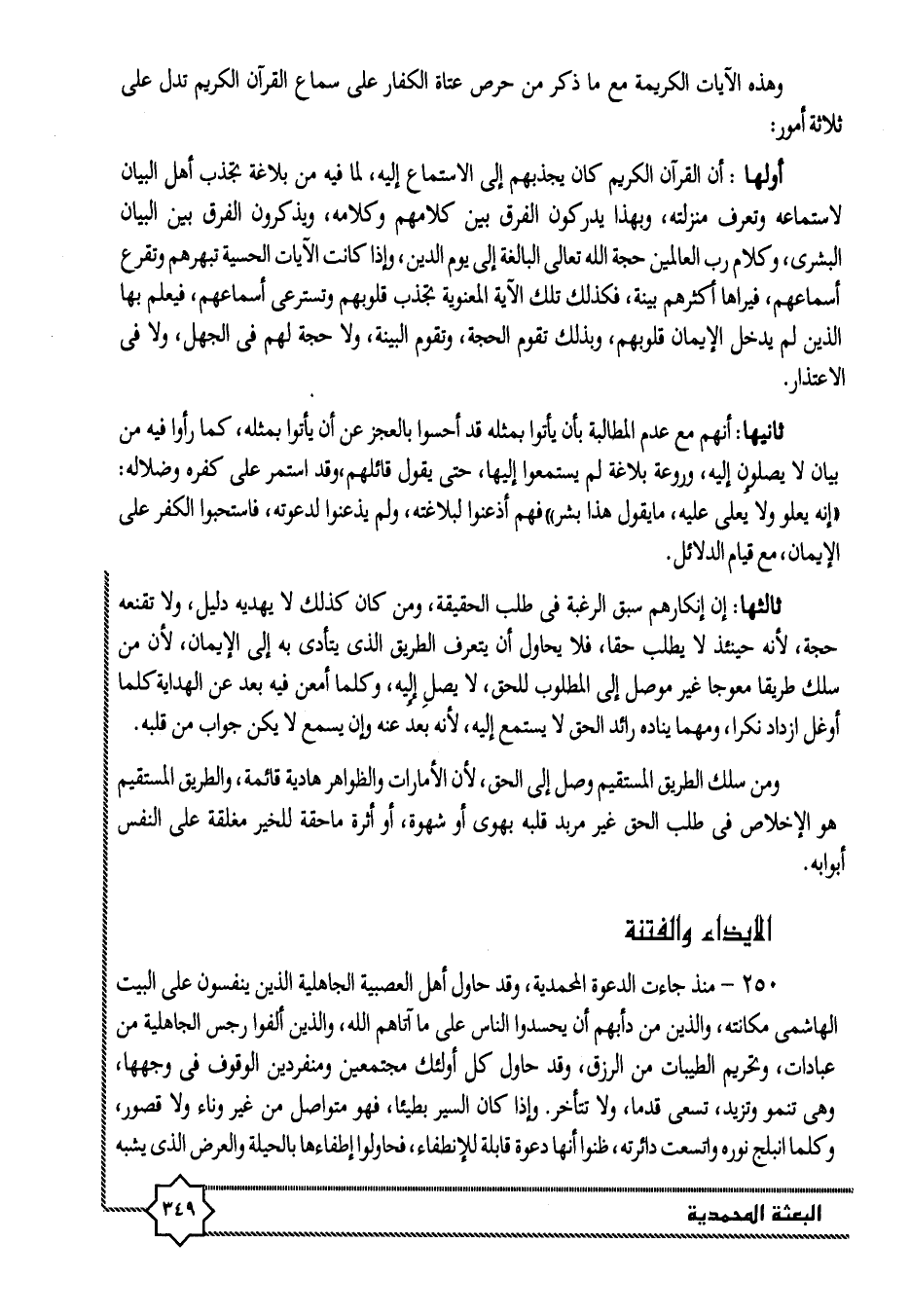 250- منذ جاءت الدعوة المحمدية، وقد حاول أهل العصبية الجاهلية الذين ينفسون على البيت الهاشمى مكانته، والذين من دأبهم أن يحسدوا الناس على ما اتاهم الله، والذين ألفوا رجس الجاهلية من عبادات، وتحريم الطيبات من الرزق، وقد حاول كل أولئك مجتمعين ومنفردين الوقوف فى وجهها، وهى تنمو وتزيد، تسعى قدما، ولا تتأخر. وإذا كان السير بطيئا، فهو متواصل من غير وناء ولا قصور، وكلما انبلج نوره واتسعت دائرته، ظنوا أنها دعوة قابلة للإنطفاء، فحاولوا إطفاءها بالحيلة والعرض الذى يشبه