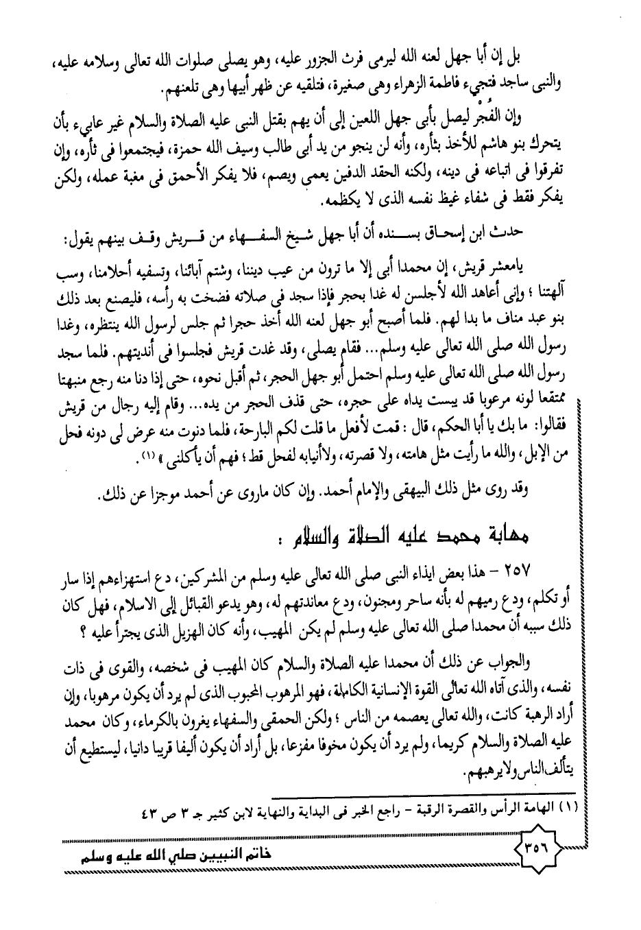257- هذا بعض ايذاء النبى صلى الله تعالى عليه وسلم من المشركين، دع استهزاءهم إذا سار أو تكلم، ودع رميهم له بأنه ساحر ومجنون، ودع معاندتهم له، وهو يدعو القبائل إلى الاسلام، فهل كان ذلك سببه أن محمدا صلى الله تعالى عليه وسلم لم يكن المهيب، وأنه كان الهزيل الذى يجترأ عليه؟