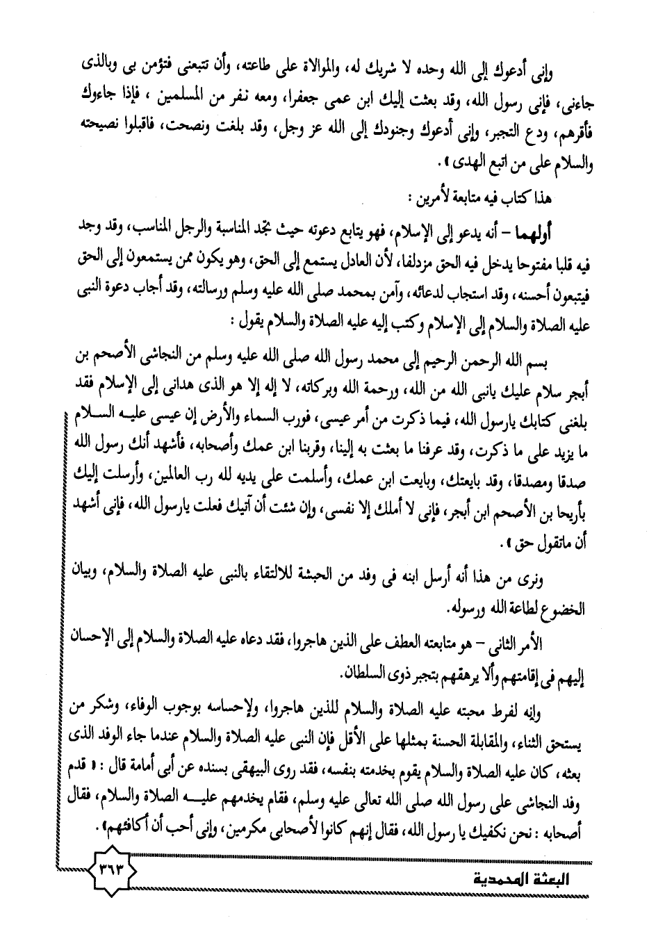 وإنى أدعوك إلى الله واحده لا شريك له، والموالاة على طاعته، وأن تتبعنى فتؤمن بى وبالذى جاءنى، فإنى رسول الله، وقد بعثت إليك ابن عمى جعفرا، ومعه نفر من المسلمين، فإذا جاؤك فأقرهم، ودع التجبر، وإنى أدعوك وجنودك إلى الله عز وجل، وقد بلغت ونصحت، فاقبلوا نصيحته والسلام على من اتبع الهدى» .
