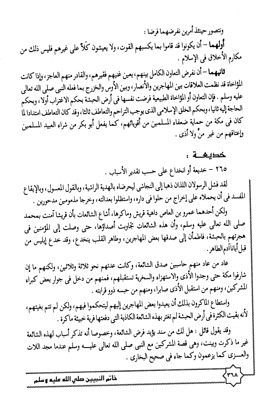 ثانيهما- أن نفرض التعاون الكامل بينهم، يعين غنيهم فقيرهم، والقادر منهم العاجز، وإذا كانت المؤاخاة قد نظمت العلاقات بين المهاجرين والأنصار، وبين الأوس والخزرج بما فعله النبى صلى الله تعالى عليه وسلم. فإن التعاون أو المؤاخاة الطبيعية فرضت نفسها فى أرض الحبشة بحكم الاغتراب أولا، وبحكم الحاجة إليه ثانيا، وبحكم الخلق الإسلامى الذى يوجب التراحم والتعاطف ثالثا، وقد كان التعاطف امتدادا لما كان فى مكة من حماية ضعفاء المسلمين من أقويائهم، كما يفعل أبو بكر من شراء العبيد المسلمين وإعتاقهم من غير منّ ولا أذى.