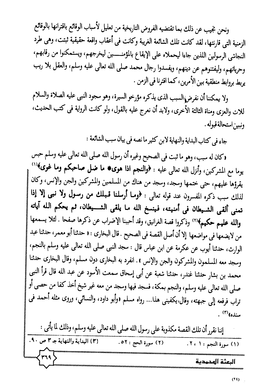 ولا يمكننا أن نفرض السبب الذى يذكره مؤرخو السيرة، وهو سجود النبى عليه الصلاة والسلام للات والعزى ومناة الثالثة الاخرى، ولابد أن نعرج عليه بالقول، ولو كانت الرواية فى كتب الحديث، ونبين استحالة قبوله.