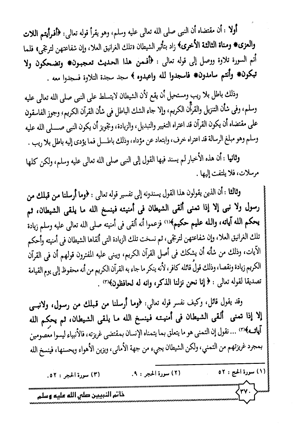 وثالثا: أن الذين يقولون هذا القول يسندونه إلى تفسير قوله تعالى: وَما أَرْسَلْنا مِنْ قَبْلِكَ مِنْ رَسُولٍ وَلا نَبِيٍّ إِلَّا إِذا تَمَنَّى أَلْقَى الشَّيْطانُ فِي أُمْنِيَّتِهِ فَيَنْسَخُ اللَّهُ ما يُلْقِي الشَّيْطانُ، ثُمَّ يُحْكِمُ اللَّهُ آياتِهِ، وَاللَّهُ عَلِيمٌ حَكِيمٌ «1» فزعموا أنه ألقى فى أمنيته صلى الله تعالى عليه وسلم زيادة تلك الغرانيق العلا، وإن شفاعتهن لترتجى، ثم نسخت تلك الزيادة التى ألقاها الشيطان فى أمنيته وأحكم الايات، وذلك من شأنه أن يشكك فى أصل القران الكريم، ويا بنى عليه المفترون قولهم أن فى القران الكريم زيادة ونقصا، وذلك قول قائله كافر، لأنه ينكر ما جاء به القران الكريم من أنه محفوظ إلى يوم القيامة تصديقا لقوله تعالى: إِنَّا نَحْنُ نَزَّلْنَا الذِّكْرَ، وَإِنَّا لَهُ لَحافِظُونَ «2» .
