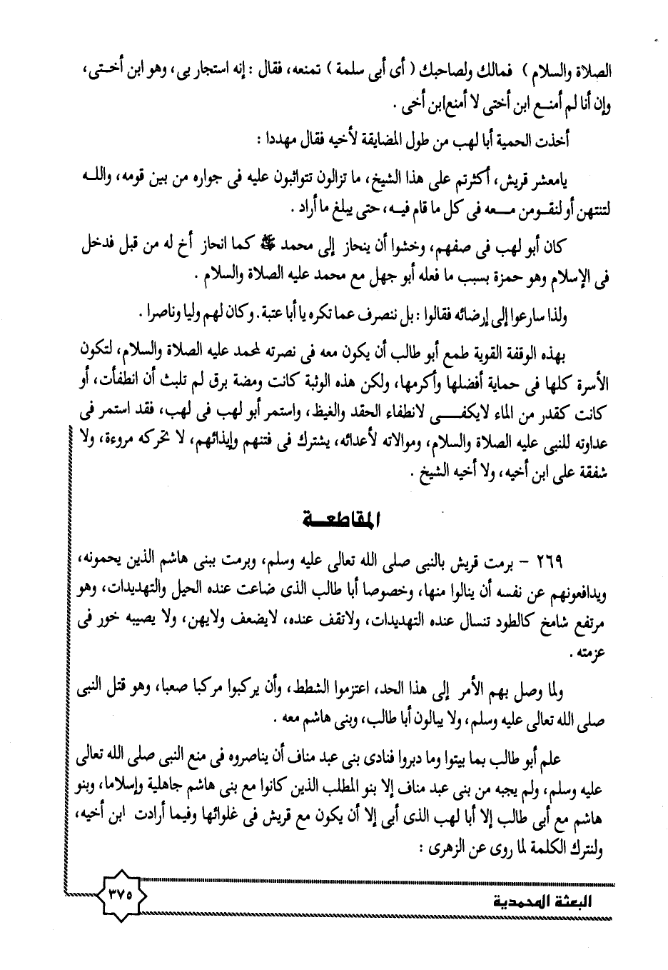269- برمت قريش بالنبى صلى الله تعالى عليه وسلم، وبرمت ببنى هاشم الذين يحمونه، ويدافعونهم عن نفسه أن ينالوا منها، وخصوصا أبا طالب الذى ضاعت عنده الحيل والتهديدات، وهو مرتفع شامخ كالطود تنسال عنده التهديدات، ولا تقف عنده، لا يضعف ولا يهن، ولا يصيبه خور فى عزمته.