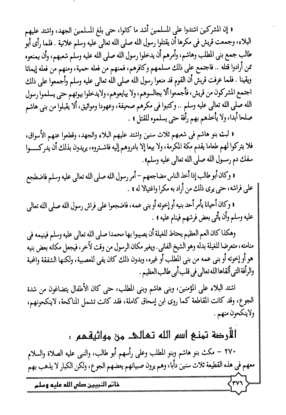270- مكث بنو هاشم وبنو المطلب وعلى رأسهم أبو طالب، والنبى عليه الصلاة والسلام معهم فى هذه القطيعة ثلاث سنين دأبا، وهم يرون صبيانهم يعضهم الجوع، ولكن الكبار لا يذهب بهم