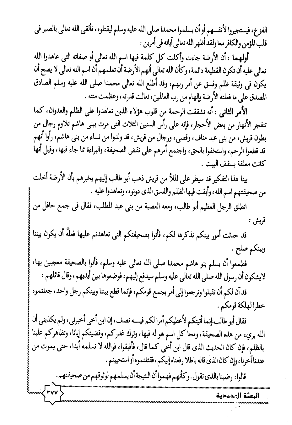 الأمر الثانى: أنه تشققت الرحمة من قلوب هؤلاء الذين تعاهدوا على الظلم والعدوان، كما تنفجر الأنهار من بعض الأحجار، فإنه على رأس السنين الثلاث التى مرت ببنى هاشم تلاوم رجال من بطون قريش، من بنى عبد مناف، وقصى، ورجال من قريش، قد ولدوا من نساء من بنى هاشم، رأوا أنهم قد قطعوا الرحم، واستخفوا بالحق، واجتمع أمرهم على نقض الصحيفة، والبراءة مما جاء فيها، وقيل أنها كانت معلقة بسقف البيت.