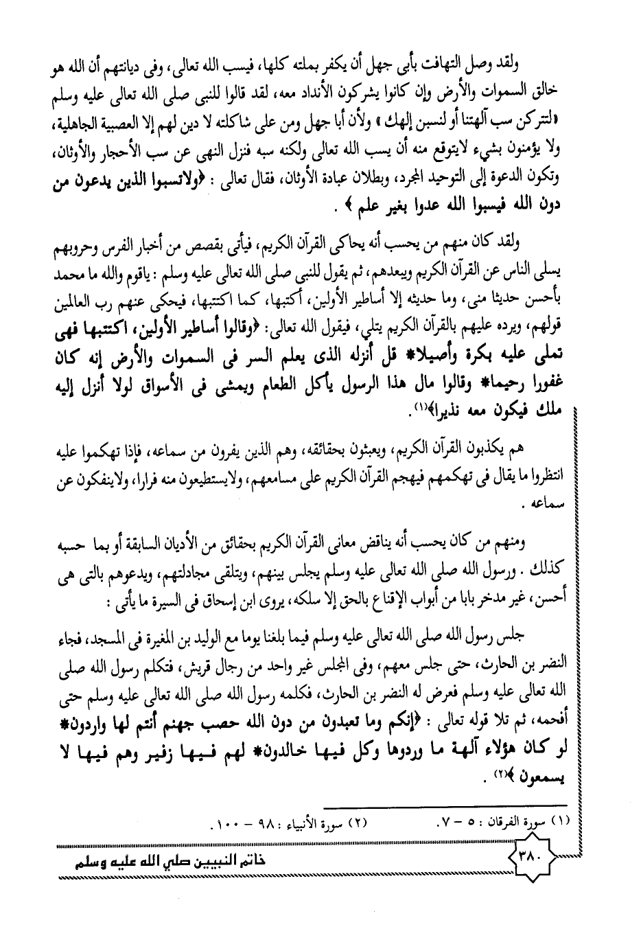 جلس رسول الله صلى الله تعالى عليه وسلم فيما بلغنا يوما مع الوليد بن المغيرة فى المسجد، فجاء النضر بن الحارث، حتى جلس معهم، وفى المجلس غير واحد من رجال قريش، فتكلم رسول الله صلى الله تعالى عليه وسلم فعرض له النضر بن الحارث، فكلمه رسول الله صلى الله تعالى عليه وسلم حتى أفحمه، ثم تلا قوله تعالى: إِنَّكُمْ وَما تَعْبُدُونَ مِنْ دُونِ اللَّهِ حَصَبُ جَهَنَّمَ أَنْتُمْ لَها وارِدُونَ.