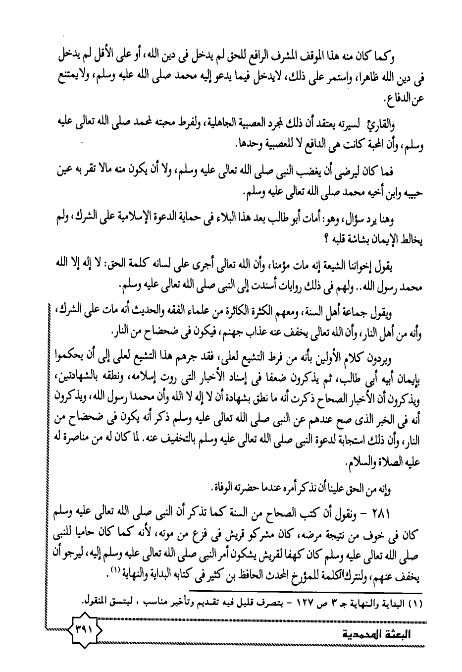 ويردون كلام الأولين بأنه من فرط التشيع لعلى، فقد جرهم هذا التشيع لعلى إلى أن يحكموا بإيمان أبيه أبى طالب، ثم يذكرون ضعفا فى إسناد الأخبار التى روت إسلامه، ونطقه بالشهادتين، ويذكرون أن الأخبار الصحاح ذكرت أنه ما نطق بشهادة ألاإله إلا الله وأن محمدا رسول الله، ويذكرون أنه فى الخبر الذى صح عندهم عن النبى صلى الله تعالى عليه وسلم ذكر أنه يكون فى ضحضاح من النار، وأن ذلك استجابة لدعوة النبى صلى الله تعالى عليه وسلم بالتخفيف عنه. لما كان له من مناصرة له عليه الصلاة والسلام.