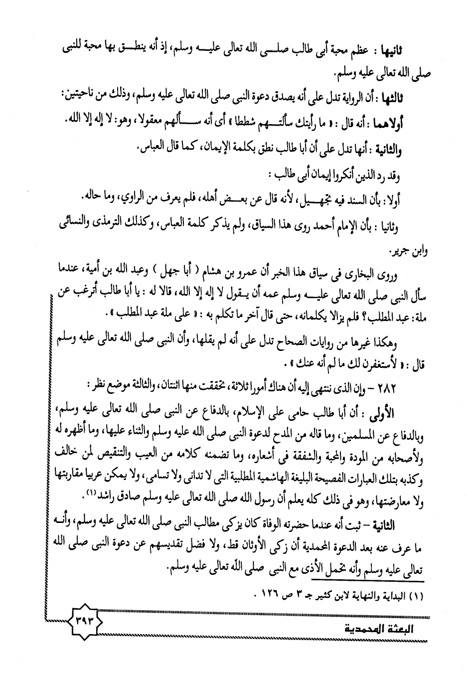 الأولى: أن أبا طالب حامى على الإسلام، بالدفاع عن النبى صلى الله تعالى عليه وسلم، وبالدفاع عن المسلمين، وما قاله من المدح لدعوة النبى صلى الله عليه وسلم والثناء عليها، وما أظهره له ولأصحابه من المودة والمحبة والشفقة فى أشعاره، وما تضمنه كلامه من العيب والتنقيص لمن خالف وكذبه بتلك العبارات الفصيحة البليغة الهاشمية المطلبية التى لا تدانى ولا تسامى، ولا يمكن عربيا مقاربتها ولا معارضتها، وهو فى ذلك كله يعلم أن رسول الله صلى الله تعالى عليه وسلم صادق راشد «1» .