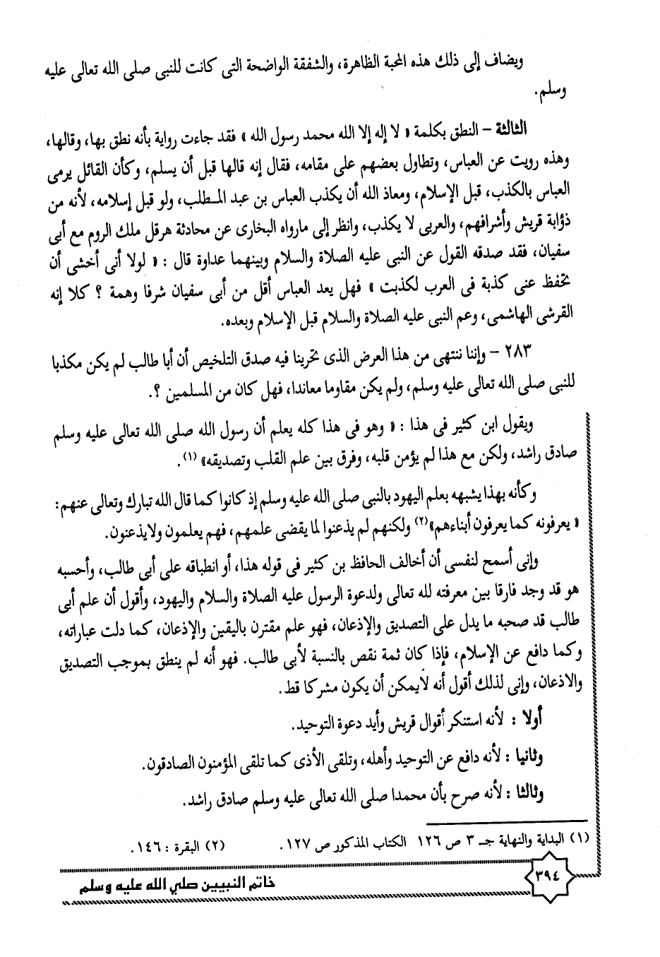 283- وإننا ننتهى من هذا العرض الذى تحرينا فيه صدق التلخيص أن أبا طالب لم يكن مكذبا للنبى صلى الله تعالى عليه وسلم، ولم يكن مقاوما معاندا، فهل كان من المسلمين؟.