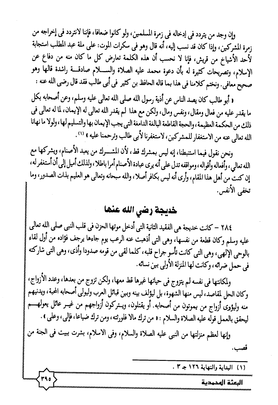 وإن وجد من يتردد فى إدخاله فى زمرة المسلمين، ولو كانوا ضعافا، فإننا لا نتردد فى إخراجه من زمرة المشركين، وإذا كان قد نسب إليه، أنه قال وهو فى سكرات الموت: على ملة عبد المطلب استجابة لأحد الأشياخ من قريش، فإنا لا نحسب أن هذه الكلمة تعارض كل ما كان منه من دفاع عن الإسلام، وتصريحات كثيرة له بأن دعوة محمد عليه الصلاة والسلام صادقة راشدة قالها وهو صحيح معافى. ونختم كلامنا فى هذا بما قاله الحافظ بن كثير فى أبى طالب فقد قال رضى الله عنه: