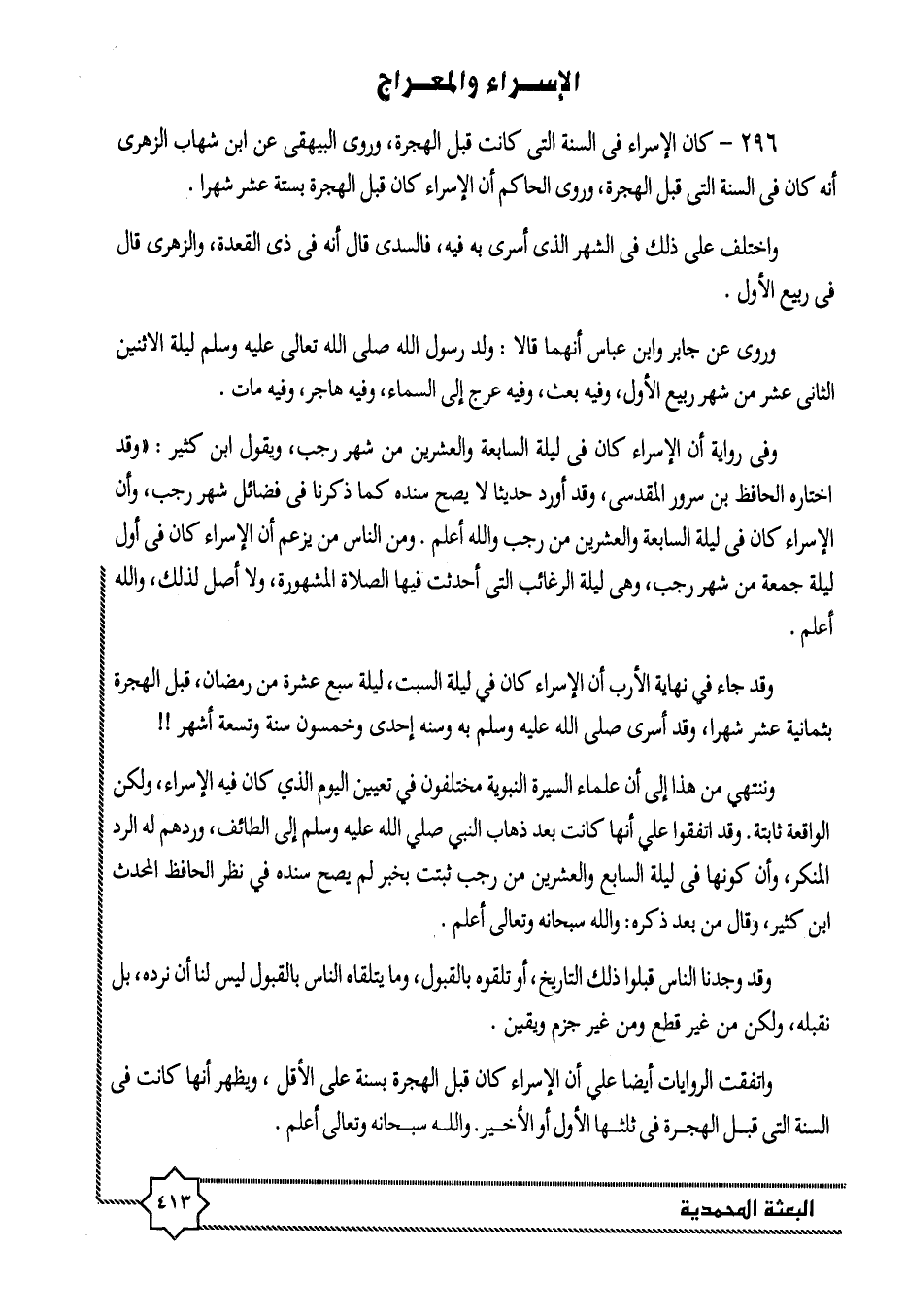 296- كان الإسراء فى السنة التى كانت قبل الهجرة، وروى البيهقى عن ابن شهاب الزهرى أنه كان فى السنة التى قبل الهجرة، وروى الحاكم أن الإسراء كان قبل الهجرة بستة عشر شهرا.