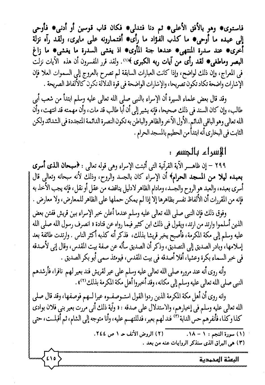 299- إن ظاهر الاية القرانية التى أثبتت الإسراء وهى قوله تعالى: سُبْحانَ الَّذِي أَسْرى بِعَبْدِهِ لَيْلًا مِنَ الْمَسْجِدِ الْحَرامِ أن الإسراء كان بالجسد والروح، وذلك لأنه سبحانه وتعالى قال أسرى بعبده، والعبد هو الروح والجسد، ومادام الظاهر لا دليل يناقضه من عقل أو نقل، فإنه يجب الأخذ به فإنه من المقررات أن الألفاظ تفسر بظاهرها إلا إذا لم يمكن حملها على الظاهر للمعارض، ولا معارض.