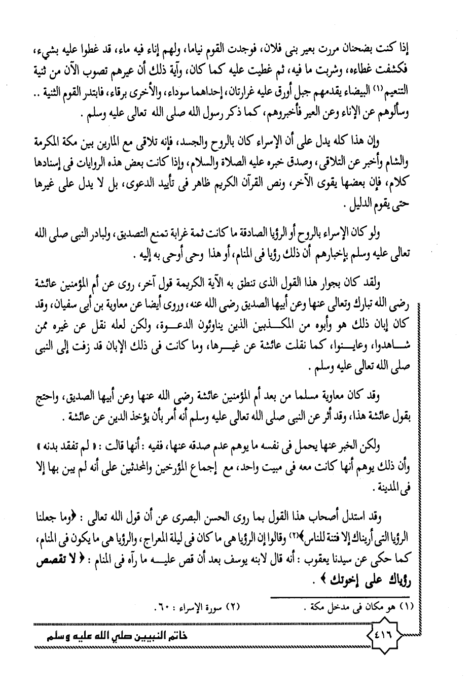 ولو كان الإسراء بالروح أو الرؤيا الصادقة ما كانت ثمة غرابة تمنع التصديق، ولبادر النبى صلى الله تعالى عليه وسلم بإخبارهم أن ذلك رؤيا فى المنام، أو هذا وحى أوحى به إليه.