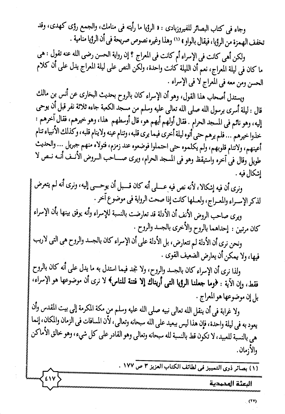 ولذا نرى أن الإسراء كان بالجسد والروح، ولا نجد فيما استدل به ما يدل على أنه كان بالروح فقط، وإن الاية: وَما جَعَلْنَا الرُّؤْيَا الَّتِي أَرَيْناكَ إِلَّا فِتْنَةً لِلنَّاسِ لا نرى أن موضوعها هو الإسراء، بل إن موضوعها هو المعراج.