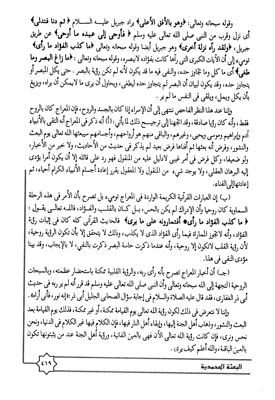 ما كَذَبَ الْفُؤادُ ما رَأى. أَفَتُمارُونَهُ عَلى ما يَرى فالحديث القرانى كله كان فى إثبات رؤية الفؤاد، وأنه لا تجوز المماراة فيما رأى الفؤاد الذى لا يكذب، وذلك لا يتحقق إلا بأن تكون الرؤية روحية، لأن رؤية القلب لا تكون إلا روحية، وأنه عندما ذكرت حاسة البصر ذكرت بالنفي، لا بالإيجاب، وقد بينا مؤدى النفى فى هذا.