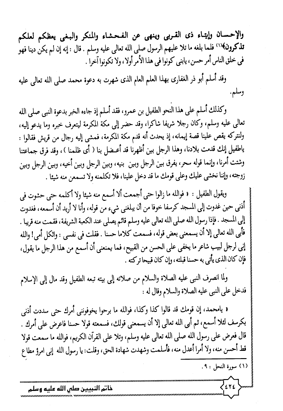 وكذلك أسلم على هذا النحو الطفيل بن عمرو، فقد أسلم إذ جاءه الخبر بدعوة النبى صلى الله تعالى عليه وسلم، وكان رجلا شريفا شاكرا، وقد حضر إلى مكة المكرمة ليتعرف خبره وما يدعو إليه، ولنتركه يقص علينا قصة إيمانه، إذ يحدث أنه قدم مكة المكرمة، فمشى إليه رجال من قريش فقالوا: