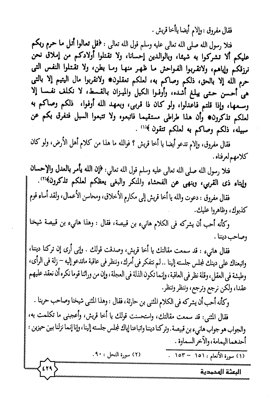 فقال مفروق، وإلام تدعو أيضا يا أخا قريش؟ فو الله ما هذا من كلام أهل الأرض، ولو كان كلامهم لعرفناه.
